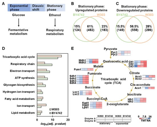 Proteome-wide abundance profiling of the changes induced by the transition from the exponential to the stationary growth phase. (A) A diagram of different carbon source metabolism happening during the exponential and stationary phases is shown. Also shown is the overlap between the stationary-phase-induced proteins with statistically significant (B) increase and (C) decrease in abundance in the two backgrounds. (D) Biological processes enrichment analysis of the proteins that are significantly higher in abundance (adjusted p-value < 0.01) in the stationary phase. (E) Relative abundance profiles of the tricarboxylic acid cycle (TCA) enzymes.