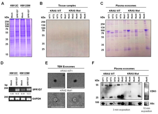 Quality control of the protein extracts used for proteomics. Coomassie blue staining of cell extracts (A), FFPE tissue samples (B), and plasma exosomes (C) confirmed the quality of the samples for the proteomics analyses. (D) The stable overexpression of SPRYD7 in KM12C and KM12SM CRC cells was confirmed by PCR in comparison to mock-stable transfected cells (control). (E) Transmission electron microscopy (TEM) of plasma extracellular vesicles isolated by differential centrifugation revealed vesicles smaller than 150 nm compatible with exosomes. Scale bar: 200 nm. (F) Western blot analysis of plasma exosomes showed the presence of Alix and CD63, two proteins specific to extracellular vesicles, confirming the quality of the exosome samples. Two different exposition times are depicted to visualize CD63 and Alix in all samples. WT: wild-type KRAS; Mut: mutant KRAS.