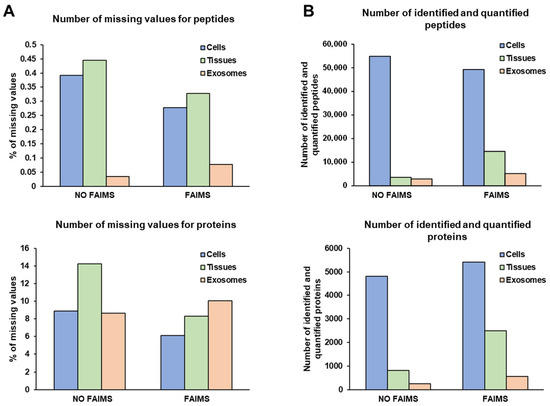 After data normalization (Figure S3C,D), the quality of the TMT labeling was confirmed by the low number of missing values obtained from identified peptides and proteins (<1% and <15%, respectively), as observed in the previous TMT experiments analyzed. In addition, lower missing values were obtained with the FAIMS technology in the two TMT experiments (Figure 9A). Next, the higher quality of the protein extracts from frozen tissue and high plasma volume exosome samples in comparison to the previous biological samples was noticed by a significant increase in the number of peptides and proteins identified in contrast to cross-linked and/or deteriorated protein samples (Figure 9B). Interestingly, a 12% and 3% reduction in the number of identified and quantified peptides was observed with the FAIMS Pro Duo Technology from frozen tissue samples and exosomes isolated from large (3 mL) plasma volumes, respectively. However, FAIMS allowed for an 11% and 26% increase in the number of identified and quantified proteins, respectively (Figure 9B). These results suggest that the use of the FAIMS interface offers limited improvements for the proteomics analysis of non-cross-linked and non-deteriorated protein samples, as previously observed for cell protein extracts. Additionally, we observed that the analysis of exosomes isolated from large plasma volumes (3 mL) significantly increased the performance of the proteomics analyses with and without the FAIMS Pro Duo interface. This observation would be due to the increased number of exosome particles isolated by centrifugation and to the reduction of the sample ratio between the highly abundant plasma contaminant proteins or highly abundant proteins and the exosome protein content. In this sense, a higher increase in the number of identified and quantified proteins with FAIMS was observed for plasma exosomes isolated from 3 mL of plasma in contrast to frozen tissue or cell protein extracts, suggesting that the FAIMS Pro Duo interface allows for a significant increase in the dynamic range of complex samples despite the presence of highly abundant contaminant proteins, such as plasma proteins (Figure S3B).