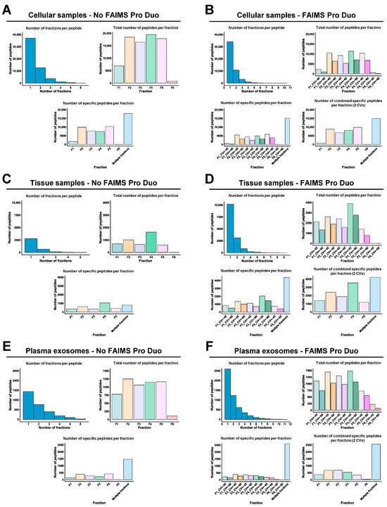 FAIMS Pro Duo Interface acts as an ion selection filter by introducing a second peptide separation at the entrance of the mass spectrometer. Therefore, using FAIMS technology with two different CVs, each peptide fraction was subsequently subdivided into two fractions, allowing for better peptide separation without increasing the time consumed per TMT experiment and reducing peptide overlapping and masking. In our experiments, this improvement was demonstrated by a significant increase (higher than 50%) in the number of total peptides and specific peptides per fraction for the FFPE tissue and plasma exosome samples (Figure 4C–F). This was also shown in the significant increase in the total number of specific peptides per fraction combining the two CV fractions in comparison with the results without FAIMS. On the contrary, for the cell protein extracts experiment, a slight decrease in the total number of peptides and specific peptides per fraction was observed with FAIMS technology. The use of FAIMS did not provide significant improvements in peptide identification with the cell protein extracts because the percentage of peptide overlapping and masking without FAIMS was lower in the cell protein samples than in the paired FFPE tissue or exosomes isolated from 250 µL of plasma samples (Figure 4). In contrast, the increased time of each mass spectrometry cycle and the CV filtering when using FAIMS resulted in a reduction in the number of identified peptides in the cell experiment (Figure 4A,B), while allowing an increased peptide fractionation and separation of co-isolating peptides in paired FFPE tissue and plasma exosome samples. However, this decrease in the number of peptides did not result in a reduction in the number of protein identifications, as previously shown (Figure 3B), but in a decrease in the protein coverage (Figure 5A,B).
