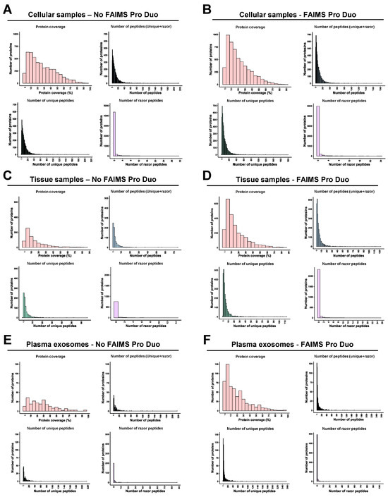 Protein analysis of each TMT experiment. No differences were obtained in the protein coverage and number of total, unique, and razor peptides per protein for the cell extract experiment without (A) or with (B) FAIMS. However, the protein coverage and the number of total, unique, and razor peptides per protein decreased for the plasma exosome and FFPE tissue samples without FAIMS (C,E) in comparison with their mass spectrometry analysis with FAIMS (D,F).