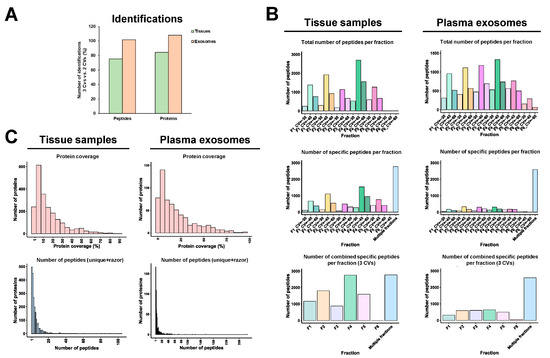 Next, we analyzed the same FFPE tissues and plasma exosomes samples in a three-hour ACN gradient using three CVs (CV = −30, CV = −45, and CV = −60) with FAIMS technology. A slight increment in the number of peptide and protein identifications (1–5% approximately) was observed for the plasma exosomes analysis with three CVs in comparison to the two CVs data, whereas a 20% decrease in the number of identifications was observed for the FFPE tissues analyzed (Figure 6A). In addition, with the three CVs, we could also observe a high peptide separation per fraction, not accompanied by an increase in the number of specific peptides per fraction, by combining the three CV fractions in comparison to the experiment with the two CVs (Figure 4D,F and Figure 6B). Finally, we could neither observe significant differences in the protein coverage nor in the number of total peptides per protein between TMT analyses with two and three CVs (Figure 5D,F and Figure 6C). In addition, and according to previous analyses [18], a higher number of peptides were identified at CV = −45 V with two and three CVs, whereas this number significantly decreased at CV = −30 V. Differences lower than 20% in the identification of peptides were observed comparing two CVs (Figure 4D,F) and three CVs (Figure 6). In FFPE-derived protein extracts, 2501 proteins were identified and quantified with two CVs and 2108 with three CVs, whereas for exosomes derived from plasma, 559 and 604 proteins were identified and quantified with two and three CVs, respectively. Therefore, these results, together with the increased consumption time of the mass spectrometer with three CVs (three hours per run), suggest that the use of three CVs should not be useful enough for routine analysis of paired FFPE tissue and plasma exosomes from clinical samples. Additionally, the increase in complexity of the mass spectrometry analysis with three CVs does not improve the quality of the proteomics data.
