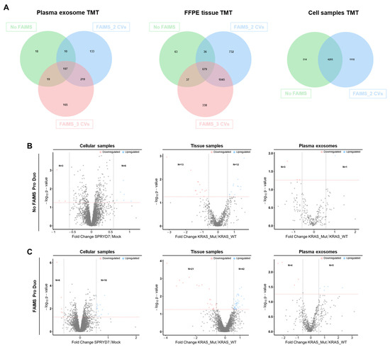 Statistical analysis of mass spectrometry data. (A) The Venn diagram of the indicated TMT experiments shows the analysis of the number of identified proteins with or without FAIMS and comparing two and three CVs. Statistical analysis for the identification of dysregulated proteins in the indicated TMT experiments, comparing the results without (B) or with (C) FAIMS Pro Duo Interface. The increase in the number of protein identifications was reflected in an increased number of dysregulated proteins in the three TMT analyses. The x-axis represents the log2 expression ratio (fold change) of protein expression differences between the two groups of study. The y-axis represents the −log10 p value. Colored dots represent differentially expressed proteins upregulated (blue, expression ratio ≥ 1.5) and downregulated (red, expression ratio ≤ 0.58) in CRC cells overexpressing SPRYD7 or in CRC patients with mutated KRAS with a p-value < 0.05. p-value = 0.05 is represented by a red dashed horizontal line, whereas the 1.5-fold expression difference is represented by two black dashed vertical lines. Grey dots represent proteins that do not fulfill the criteria for being classified as significantly dysregulated proteins.