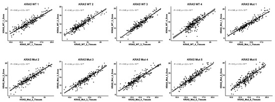 Finally, using the higher number of protein identifications obtained with FAIMS Pro Duo Interface and two CVs for the paired FFPE tissue and plasma exosome TMT analyses, we investigated the correlation between both paired protein extracts from CRC patients to determine whether the proteins identified and quantified in FFPE cancer tissue and plasma exosomes could become minimally invasive biomarkers. First, we observed a significant difference in the number of identified proteins from tissues and from plasma exosomes due to the different nature of the protein samples (Figure S2). In all cases, about 40–45% of proteins identified from exosome samples were also identified in their corresponding paired tissue samples, which represents approximately 8–10% of the total of proteins identified from tissue samples. Second, the Pearson correlation was calculated with the 231–246 common proteins in the paired FFPE tissue and plasma exosome samples. In all cases, a high positive correlation was observed between paired samples (R > 0.93), but for the KRAS WT 4 and the KRAS Mut 6 samples, the correlation decreased to R = 0.82 and R = 0.9, respectively (Figure 8). These results suggest that those proteins identified as dysregulated in cancer tissue samples might also be dysregulated in plasma samples, and that their measurement in plasma or in plasma exosomes could become blood-based biomarkers of the disease.