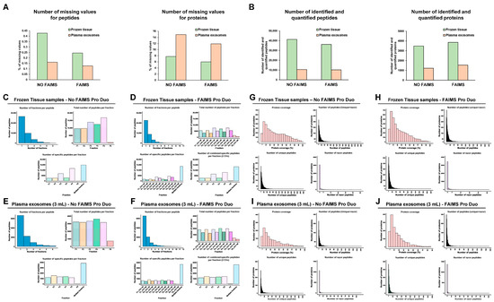 MS data analysis of the TMT experiments with non-cross-linked and/or non-deteriorated protein samples from frozen tissue and plasma exosomes isolated from large plasma samples. (A) A low number of missing values was obtained in both TMT experiments for the identified peptides (left) and proteins (right). (B) A 12% reduction and 11% increase in the number of identified and quantified peptides (left) and proteins (right), respectively, were obtained for the brain tissue protein extracts, whereas these numbers were 3% and 26%, respectively, for the exosomes isolated from large plasma volumes (3 mL) experiment. The analysis of the number of fractions where each peptide was identified, the number of total peptides per fraction, and the number of specific peptides per fraction without (C,E) or with (D,F) FAIMS Pro Duo Interface highlighted the increased peptide separation obtained with FAIMS technology. The analysis of the proteins identified and quantified in each TMT experiment revealed no changes in the number of total, unique, and razor peptides obtained without (G,I) or with (H,J) FAIMS technology, whereas a slight reduction in the protein coverage was observed in both experiments.