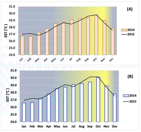 Monthly average sea surface temperatures (SST) during cold season (Jan–Feb) and warm season (Sep–Oct) at the inner-shelf reef Enrique (A) and at the mid-shelf reef San Cristobal (B), respectively, in La Parguera, Puerto Rico, during 2014 (square bars) and 2015 (black lines). The yellow in the gradient background indicates the highest temperature.