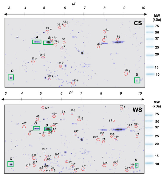 Two-dimensional gel electrophoresis showing differentially expressed proteoforms in Orbicella faveolata during cold season (CS) and warm season (WS). The top arrow from 3–10 (pI) represents the isoelectric point, defined as the pH at which the protein has no net charge, and the red circles with numbers from 1 to 42 on the 2D gels represent the proteoforms analyzed by MALDI-TOF/TOF. Common proteins are represented by green squares with capital letters A, B, C and D. ↑: Upregulated proteoforms, ↓: Downregulated proteoforms. Molecular Weight (MW) kilodalton (kDa).