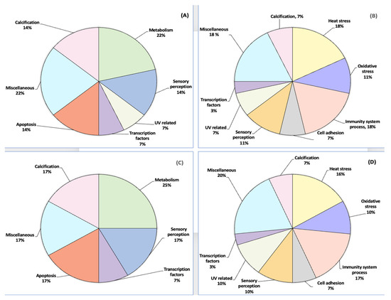 Pie representation of the proteoforms expressed according to their function in Orbicella faveolata. (A). Cold season at the inner-shelf reef Enrique, (B). Warm season at the inner-shelf reef Enrique, (C). Cold season at the mid-shelf reef San Cristobal, (D). Warm season at the mid-shelf reef San Cristobal.