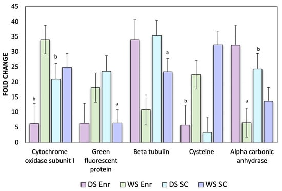 To verify the reliability and reproducibility of our MS results, RT-qPCR was used to confirm the presence and relative abundance of mRNA transcripts corresponding to the proteins. The qPCR data from all five genes were transformed and normalized according to the methods proposed by Hellemans and colleagues, with M (stability values) and CV (coefficient of variations) lower than 1 and 50%, respectively [25]. The ΔΔCt model was used to analyze the relative quantification of the real-time PCR (Supplementary Table S2). Differences in gene expression were assessed with linear regression using the two temperature conditions of the cold and warm seasons.