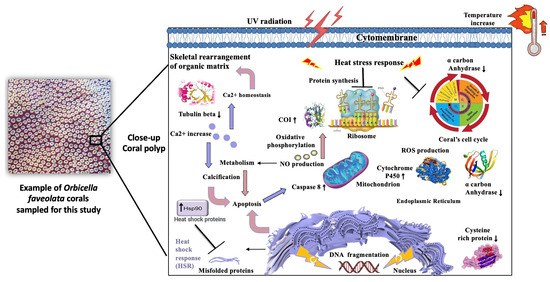 Exposure to elevated temperature intensifies coral stress, resulting in changes in the metabolic state of the coral. Failure of the O. faveolata normal cellular processes at a transcriptional/posttranslational level can cause the upregulation of key proteins released by the mitochondria or the ribosome structures. One of these differentially expressed proteins is cytochrome P450, known to be associated with mitochondrial function [46,47]. Other upregulated molecular proteoforms identified, which are well known to mitigate oxidative stress, such as ATP synthase, apextrin, and toll-like receptors, can also be involved in the first line of a marine organism’s physiological defense [47] (Table 2).