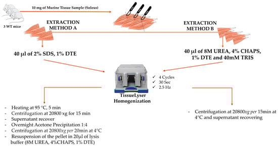 Flowchart of the two different extraction protocols. A total of 10 mg of soleus samples from three wild-type mice was divided into two sections using a scalpel. Each section obtained from the same soleus sample was processed by a different extraction method. Method A comprised the extraction buffer containing 2% w/v SDS and 1% w/v DTE and homogenization by TissueLyser II (Qiagen, Hilden, Germany). After homogenization, the samples were incubated at 95 °C for 5 min, and after centrifugation at 20,800× g per 15 min at RT, the obtained supernatant underwent overnight cold acetone precipitation (1:4) at −20 °C. After centrifugation at 20,800× g per 20 min at 4 °C, the pellets were recovered and resuspended in 20 µL of lysis buffer composed of 8 M UREA, 4% w/v CHAPS and 1% w/v DTE. Method B comprised the extraction buffer containing 8 M UREA, 4% w/v CHAPS, 1% w/v DTE and 40 mM TRIS and homogenization by TissueLyser II; the solubilized proteins were recovered in the supernatant after centrifugation at 20,800× g per 15 min.