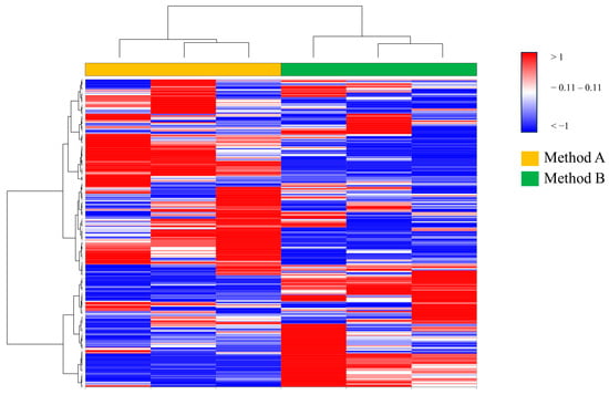 A supervised heatmap analysis was performed on significant differential spots between Methods A and B. A color change from blue to red indicates lower or higher protein abundance, respectively. Each row corresponds to a differential protein spot, while each column corresponds to an individual 2DE gel (sample). If assigned to a protein species, the row corresponding to the differential protein spots reports the UniProt entry name.
