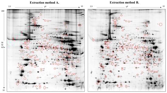 Reference gel maps for extraction Methods A and B. The red circles represent the statistically relevant spots, with a fold change ratio of ≥ 3 between the two extraction methods. Each number is associated with a specific protein species, reported in Table S1.
