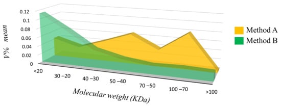 One hundred and seventeen spots with qualitative differences are shown in the supervised heatmap in Figure 4 and Table S1, prevalently present in Method B and overall in the low MW range (Figure 5). These findings corroborate the hypothesis that several protein species are lost after acetone precipitation. On the other hand, in Method A, some spots in the high MW range showed enrichment in abundance (Figure 5).