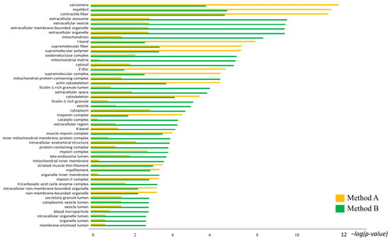 Histograms reporting the comparisons of GO localization terms of up-regulated proteins in extraction Methods A and B.