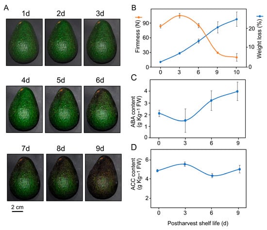 Hass avocado ripening under normal conditions at room temperature. (A) Avocado coloration during postharvest shelf life (PSL) (1–9 days). (B) Drastic water transpiration and decreased firmness. Endogenous content of (C) abscisic acid (ABA) and (D) 1-aminocyclopropane-1-carboxylate (ACC) in avocado pericarp in postharvest period.