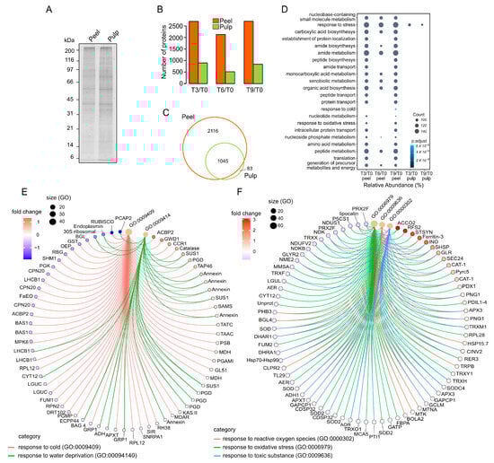 Overview of peel and pulp proteome landscape of Hass avocado during PSL. (A) Representative peel and pulp protein band in SDS-PAGE gel. (B) Number of proteins and (C) grouping identified in peel and pulp by the TMT-SPS-MS3 approach. (D) Dot plots considering more than 30 protein-based gene ontology (GO) biological process enrichment analysis. (E) Visual representation of circular network of proteins associated with cold and response to water deprivation. (F) Visual representation of circular network of proteins associated with response to ROS, oxidative stress, and toxic substance.