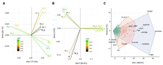 Protein dynamic accumulation in Hass avocado fruit tissues during PSL-based principal component and clustering analyses. Protein abundances identified in PSL period in (A) peel and (B) pulp samples were normalized by scaling (range 0–1) for PCA. A high cos2 indicates a strong representation of the variable on the principal component. T0 indicates samples just after harvest; T3, T6, and T9 indicate samples after three, six, and nine days of postharvest shelf life. Numbers 1, 2, and 3 in labels specify the three biological replicates. (C) k-means clustering of normalized protein abundances in PSL. Phosphoglycerate kinase (Pgk), glutathione S-transferase (GST), glyceraldehyde 3-phosphate dehydrogenase (GAPCP), succino-aminoimidazole-carboximide RN synthetase (PUR7), fructose-bisphosphate aldolase (FBA), ATP synthase subunit beta (ATP5B), abscisic stress-ripening protein 2-like (ABA_SRP), aldehyde dehydrogenase (ALDH2B), polygalacturonase (PG), endochitinase (CHI), 1-aminocyclopropane-1-carboxylate oxidase (ACCO2), Endoglucanase 1 (GUN).