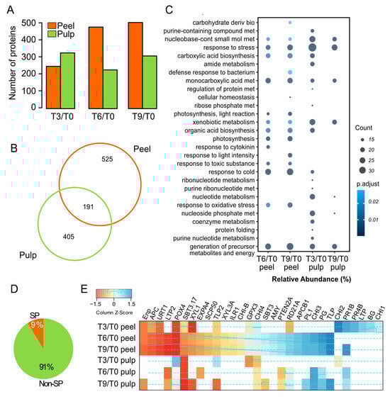 By focusing particularly on those proteins with a log2 fold change (T3/T0, T6/T0, and T9/0) of >0.58 and <−0.58, and a p value of 0.05, we were able to visualize more differential proteins in peel than pulp samples after six and nine days of the postharvest period (Figure 4A). We determined 525 and 405 specific differential proteins in peel and pulp, respectively (Figure 4B), while a total of 191 proteins were determined as differential in both peel and pulp samples. Gene ontology enrichment showed biological processes such as a response to stress, generation of precursor metabolites and energy, monocarboxylic, nucleobase-containing small molecule, and xenobiotic metabolisms, which were overrepresented in both peel and pulp samples (Figure 4C). Meanwhile, the biological processes in T3/T0 peel and T6/T0 pulp did not have enriched proteins (Figure 4C). In contrast, carbohydrate-derivative biosynthesis, the defense response to bacteria, photosynthesis, cold, oxidative stress, and toxic substances, was overrepresented in the peel. Due to the lower representation of secreted protein in GO enrichment protocols, we predicted the occurrence of signal peptide (SP) in all determined differential proteins. By doing so, we were able to visualize a small proportion of proteins with a positive prediction of SP (9%). Peel proteins demonstrated a more dynamic accumulation of the predicted secreted proteins (Figure 4E). For example, endochitinase 2 (CHI2), pathogenesis-related proteins (PR1B, PR-4B), thaumatin-like protein (TLP), non-specific lipid-transfer protein Lac s 1 (lipid transfer protein, LTP), probable pectate lyase 1 (PL1), and polygalacturonase (PG) were over-accumulated during the postharvest period. The endoplasmin homolog (Enp), aspartyl protease family protein (APC), rhamnose:rhamnosyltransferase 1 (URT1), peroxidase 4 (POX4), expansin-A4 (EXPA4), alpha-xylosidase 1 (XYL1), and subtilisin-like protease (SBT3.17) were under-accumulated.
