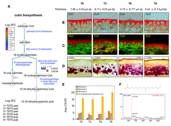 Avocado structural feature modulation during PSL. (A) Cutin biosynthesis pathway-based plant metabolic pathway database (PMN) platform. Cuticular morphological features during PSL visualized with (B) epifluorescence and (C) fluorescence microscopy. (D) Lignin visualization using phloroglucinol–HCl staining in pericarp cross-sections. (E) Cutin monomer accumulation during PSL and (F) 10,16-dihydroxyhex-adecanoic acid MS/MS spectra and assignation by accurate mass spectrometry. In (B,C) AP, anticlinal pegs; EC, epidermal cells; ASG, attached sub-epidermal globules.