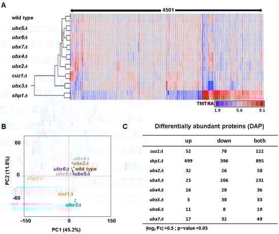 To explore protein alterations at the global level, we performed both hierarchical clustering analysis (HCA) and principal component analysis (PCA). HCA utilized the Euclidian distance metric and Ward linkage on the relative abundance measurements of the 4501 proteins from this experiment (Figure 2A). Duplicates of the strains clustered together, as anticipated. Interestingly, the shp1Δ strain clustered separately from the others, suggesting a more substantial alteration in global proteome abundance. Similarly, PCA confirmed the tight clustering of duplicates in the dataset (Figure 2B). PC1 explained over 45% of the variance (driven by differences in the shp1Δ strain), while PC2 explained approximately 12% (driven by differences among strains). PCA also highlighted the similarity between the wild type strain and five adaptor deletion strains (ubx2Δ, ubx4Δ, ubx5Δ, ubx6Δ and ubx7Δ) and the difference of the shp1Δ strain from the others. Furthermore, PCA revealed a certain degree of similarity between the cuz1Δ and ubx3Δ strains, which clustered closely together. Having validated the strains used in the experiment and observed the expected clustering of duplicates, we proceeded to further analyze the variations in the proteomes of specific deletion strains.