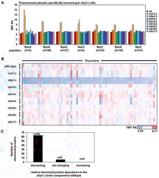 Markers of proteotoxic stress are present in the shp1Δ strain but not in the other strains analyzed. (A) Bar graph illustrating the TMT relative abundance of the proteasome transcription factor Rpn4 and of the proteasomal subunits (Rpn9, Rpn5, Nas2, Rpt3, Rpn6 and Rpt2) in the strains used in this experiment. The number of peptides detected for each protein is indicated. (B) Heatmap showing the relative protein abundance of the ribosome subunits detected in the experiment. (C) The number of ribosome subunits and their behavior in the shp1Δ strain compared to the wildtype strain is shown.