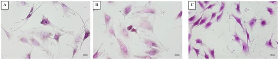 Regarding the cytoplasm, differences also appeared among the three steps. In this case, we used eosin to stain the basic substances of the cell, such as the cytoplasm. In P2/C (Figure 1A), the cytoplasm is only stained with eosin, achieving a pinker color. However, as the cells aged, the cytoplasm not only presents a darker color, as shown in P23/SS (Figure 1C), in which it becomes more purple in color, but also appears more granular. Aged cells can accumulate more acidic substances in the cytoplasm, such as RNA. One of the reasons that this may occur is due to an increase in protein synthesis in response to stress or an accumulation of acid residues due to a decrease in cellular degradation, both processes associated with aging. In turn, senescent cells usually show an increase in transcriptional activity and the production of both rRNA and mRNA, which leads to an increase in the amount of acidic material in the cytoplasm, thus staining with hematoxylin.