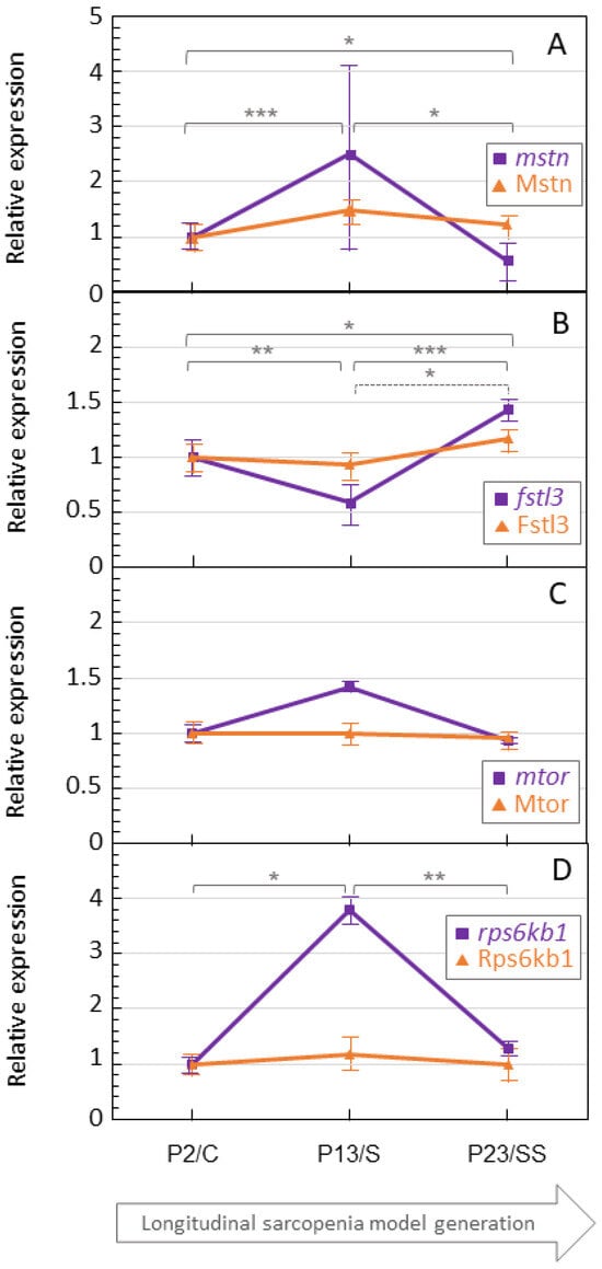 Relative gene (□) and protein (Δ) expression of myostatin (A), follistatin (B), mTOR (C), and RPS6KB1 (D) along the C2C12 sarcopenia model. Mean and standard deviation are shown for each point. * p < 0.05, ** p < 0.01, *** p < 0.001. Significance between data pairs is shown with solid lines for gene expression and dotted lines for protein expression.
