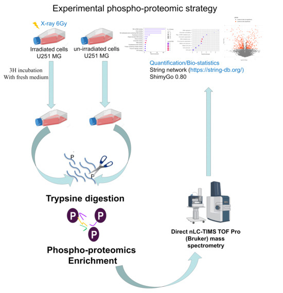 Phosphoproteomics quantitative mass spectrometry-based analysis strategy in GBM U251 cell line after irradiation with X-rays at 6 Gy to discover the early response of the cell line. After irradiation, cells were digested with trypsin for protein extraction and phosphoproteomics enrichment. This step was followed by mass spectrometry and data analysis (https://string-db.org/, accessed on 1 February 2024).