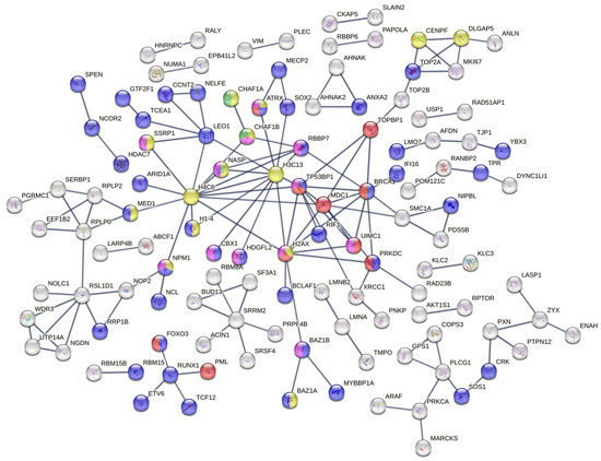 STRING was used to construct a PPI network. PPIs with a confidence higher than 0.9 were selected to ensure the quality of interaction and minimizer false-positive results. The network created from DEPs (Figure 3) showed many clusters related to DNA repair.