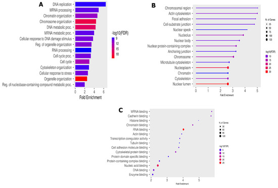 To understand the biological functions of the 453 modulated phosphopeptides, we assessed the GO enrichment analysis using ShinyGo 0.80. An adjusted p-value of <0.05 was set as the cutoff criterion for screening pathway enrichments. The GO enrichment analysis categorized the results into three main categories: biological processes (BPs), cellular components (CCs) and molecular functions (MFs). The top 30 GO enrichment analysis results showed a significant enrichment of GO terms associated with DNA replication (GO:00062260) and mRNA processing (GO:0006281). Alongside this significant enrichment, we notice an important enrichment of DNA repair (GO:0006281) and cell cycle processes (GO:0007049) in the BPs (Figure 4A).