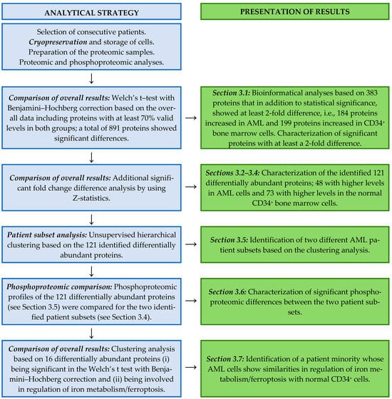 Our initial strategy was the comparison of the protein levels for all 50 AML patients and the eight normal CD34+ bone marrow cell populations by using Welch’s t-test with Benjamini–Hochberg correction (i.e., FDR < 0.01) as described in Section 3.1. As an alternative and additional statistical strategy to our previous use of a fold change cut-off value (i.e., 2-fold; see Section 3.1) we conducted a significant fold change difference analysis (Z-statistics) of the 891 proteins identified in the initial step analysis described in Section 3.1. By using this approach, we identified only 48 proteins with significantly increased levels in AML cells and 73 proteins with increased levels in the normal CD34+ bone marrow cell populations (Table S5; see also Figure 2); all these proteins were among the most significant in Welch’s t-test with Benjamini–Hochberg correction (as indicated in Tables S1 and S2).