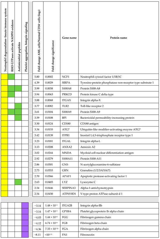 Proteomic comparison of proteins being statistically significant both in the initial Welch’s t-test analysis with at least a 2-fold difference and also in the additional AML cell/normal CD34+ bone marrow cell fold change comparison (Z-statistics, p < 0.05)—an overview of proteins included in the top-ranked Reactome terms (see Figure 2A,B). The Reactome terms are given at the top of the figure. The left part of the figure shows the proteins included in the two overlapping terms neutrophil degranulation (R-HSA-6798695, 21 proteins) and innate immune system (R-HAS-168249, 17 overlapping proteins), presented in yellow as a single column, and the two terms (left middle) RHO GTPases activate NADPH oxidase (middle–left, R-HAS-5668599) and antimicrobial peptides (middle–right R-HAS-6803157) presented in green. All these terms were enriched in the primary AML cells. The right column in purple shows all proteins with increased levels in normal CD34+ cells and included in the overlapping Reactome terms p130Cas linkage to MAPK signaling for integrins R-HAS-372708, platelet aggregation (plug formation) R-HAS-76009, integrin signaling R-HAS-354192, and signaling by high-kinase activity BRAF mutants R-HAS-6802948 (see Figure 2A).