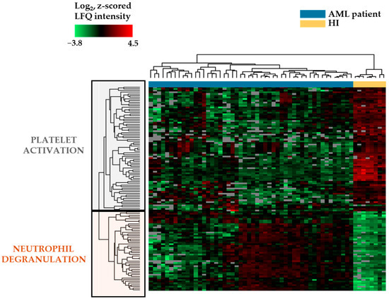 Hierarchical clustering analysis based on the proteomic profile for primary AML cells derived from 50 patients and eight CD34+ bone marrow cell populations derived from healthy individuals (HI). The clustering of normal and leukemic cells is shown at the top of the figure; the clustering of the 121 differentially abundant proteins after analysis of fold change significance (Z-statistics) is shown in the left part of the figure. The ranking of patients from left to right is presented in Table S7 and the ranking of the proteins from the top to bottom is presented in Table S8. The two main protein clusters are referred to as platelet activation and neutrophil degranulation due to their inclusion of proteins classified in Reactome terms that reflect these processes (see Tables S6 and S7).