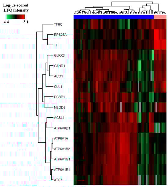 The Reactome term “Iron metabolism” and the KEGG term “Ferroptosis” included only three of the 121 differentially abundant proteins showing at least a 2-fold difference when comparing AML cells and normal CD34+ bone marrow cells and, in addition, being identified in the z-score analysis (Tables S1, S2 and S5). However, 13 additional iron metabolism/ferroptosis proteins also showed statistically significant (Welch’s t-test with Benjamini–Hochberg correction) but without being identified in the z-score analysis (see figure legend). Our comparison of iron metabolism/ferroptosis regulation in primary AML cells and normal CD34+ bone marrow cells was, therefore, based on these 16 proteins (Table S12). The identified proteins are involved in the regulation of cellular iron uptake and intracellular endosomal release (TFRC, TF, ACO1, several V-ATPase components), regulation of iron homeostasis (ACO1), and/or various steps/characteristics of ferroptosis—i.e., altered regulation of cellular iron metabolism/handling (TFR, TFRC, ACO1, CUL1, CAND1), altered redox balance (GLRX3), altered lipid metabolism (ACSL1), and protein ubiquitination/degradation (RPS27A, CAND1, CUL1, NED8, ATG7) (Table S12, [80,81,82,83,84,85,86,87,88,89,90,91,92,93,94]).