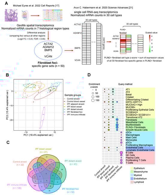 - Blumhagen, R.Z.; Kurche, J.S.; Cool, C.D.; Walts, A.D.; Heinz, D.; Fingerlin, T.E.; Yang, I.V.; Schwartz, D.A. Spatially Distinct Molecular Patterns of Gene Expression in Idiopathic Pulmonary Fibrosis. Respir. Res. 2023, 24, 287. [Google Scholar] [CrossRef] [PubMed]