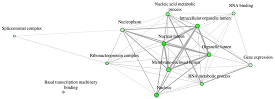 Network analysis enrichment of terms related to significant (phospho)proteins in the comparison between 2G12 and 353/11 was performed using ShinyGO (version 0.80) (Figure 5). The significant terms are predominantly associated with the nucleus and include a wide range of terms like “basal transcription machinery binding”, “spliceosomal complex”, “ribonucleoprotein complex”, “RNA metabolic process”, “RNA binding”, “nucleic acid metabolic process”, “gene expression”, “nuclear lumen”, “nucleoplasm”, “nucleus”, “intracellular organelle lumen”, “membrane-enclosed lumen”, and “organelle lumen” (Table S9). A few phosphoproteins are responsible for the significance of these terms and are therefore described in more detail here.