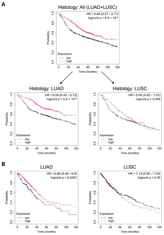 Next, we analyzed the prognostic significance of CXorf38 in lung cancer using two independent datasets (microarray and RNA-seq) from the KM plotter database [26]. Our analysis of the microarray dataset indicated that higher CXorf38 expression correlates positively with survival in patients with lung cancer (Figure 2A). However, when stratified by cancer histology, lung adenocarcinoma showed statistically significant results but not for lung squamous cell carcinoma (even though the p-value was very close to 0.05) (Figure 2A). Similar results were obtained using the RNA-seq dataset (Figure 2B). Collectively, these findings indicate that CXorf38 is a prognostic biomarker for lung adenocarcinoma but not lung squamous cell carcinoma.