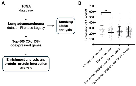 (A) Schematic representation of the experimental design used to study the roles of CXorf38 in lung cancer using clinical database analysis. (B) Levels of CXorf38 in lung adenocarcinoma samples (n = 348) derived from TCGA database. Error bars represent the mean ± standard deviation. The two-tailed Student’s t-test was used to determine significant differences between the means of two groups. ** p < 0.01.