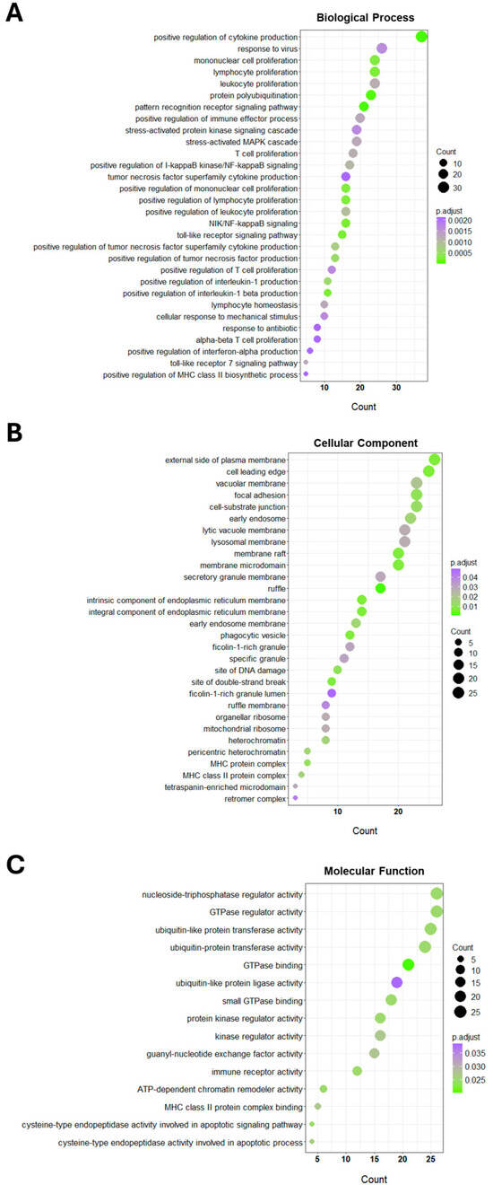 Bubble plot of Gene Ontology (GO) enrichment analysis of the top 500 CXorf38-coexpressed genes in lung cancer samples described in Figure 3A. Selected genes were classified using the GO categories: (A) biological process, (B) cellular component, and (C) molecular function.