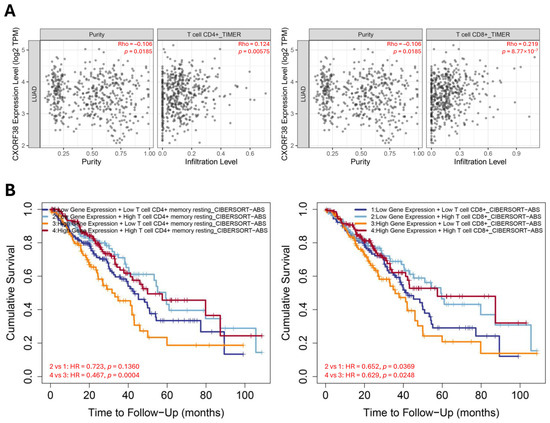 The tumor microenvironment and ICI are two important regulators of tumor growth and progression [31,32]. To further verify the relationship between CXorf38 and immune infiltration, we conducted a correlation analysis using the TIMER2.0 database. The results revealed a significant positive correlation between CXorf38 expression and ICI in lung adenocarcinoma (Figure 6A), in which this correlation was also linked to improved overall survival in patients with lung adenocarcinoma with high expression of CXorf38 stratified by CD4+ T cell level (Figure 6B). However, when stratified by CD8+ T cell level, it was shown that a higher level of CD8+ T cells was always beneficial for survival regardless of CXorf38 expression level (Figure 6B). Nevertheless, the results obtained in our study suggested that CXorf38 might be involved in regulating the immune microenvironment of tumors, which could have implications for the survival of patients with lung cancer. Overall, further studies are warranted to validate the above bioinformatic data as well as to elucidate the underlying mechanisms of CXorf38 in lung cancer.