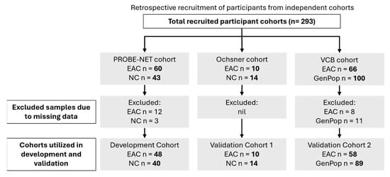 This study analysed the serum samples from three independent cohorts: the Progression of Barrett’s Oesophagus to Cancer Network (PROBE-NET, Sydney NSW, Brisbane QLD, Adelaide SA and Melbourne VIC, Australia) study, the Ochsner Health System (Ochsner, New Orleans, LO, USA) and the Victorian Cancer Biobank (VCB, Melbourne, VIC, Australia) (Figure 1). The details of the PROBE-NET and Ochsner cohorts have been published elsewhere [20,22]. The development cohort comprised 103 samples from the PROBE-NET study, collected between 2008 and 2016, including 60 participants diagnosed with EAC based on the endoscopy and histopathology and 43 controls confirmed as not having EAC (or BE) at the endoscopy (NC). Of these, 15 samples were excluded due to missing BMI data (n = 12 EAC and n = 3 NC). The first validation cohort contained 24 participants from the Ochsner study, collected 2014–2015, with 14 confirmed via endoscopy to be NC and 10 confirmed by endoscopy as EAC. The second validation cohort comprised 166 samples from the VCB, which recruited participants from five hospital-integrated biobanks through a central lead agency in Melbourne, Australia. A total of 66 of these samples were confirmed to have had EAC via endoscopy and 100 GenPop healthy donor controls with no known history of cancer, all of which were recruited through the biobank consortium and fulfilled the following inclusion criteria: were above the age of 18 years, not pregnant or lactating and able to give informed consent. Some samples were excluded due to missing BMI data (n = 8 EAC and n = 10 GenPop controls) and one further GenPop control excluded due to incomplete analytical data. Whilst a pathological diagnosis was available for all the samples (namely the presence or absence of EAC), information on the stage of EAC was not consistently available. A similar procedure of the serum collection was followed across all the study sites with the serum collected according to standard protocols [20,22]. All the serum samples were stored at −80 °C prior to study. Additionally, de-identified clinical information including age, body mass index (BMI) and sex were available for the three cohorts. This data was integrated with glycoprotein relative concentration measurements for analysis and model development. Informed consent was obtained from all the participants at the point of recruitment for each separate study and ethics was obtained by each participating institution, with the validation of the VCB cohort by Proteomics International approved by the Bellberry ethics committee (Bellberry Limited NHMRC-registered EC00372 HREC 2023-01-006-A-4).