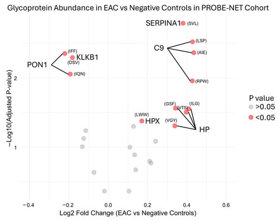 Differential glycoprotein fold change abundance in esophageal adenocarcinoma compared to negative controls in PROBE-NET cohort for development of assay. Relative peptide concentration is represented here with first three letters of peptide sequence by log2 fold change of peak area ratio of each glycoprotein over internal standard. Full sequences are available in Supplementary Table S2. p values are from bivariate analysis using Mann–Whitney U Testing between EAC and negative controls. EAC = esophageal adenocarcinoma, SERPINA1 = alpha-1-antitrypsin, C9 = complement C9, HP = haptoglobin, HPX = hemopexin, PON1 = serum paraoxonase/arylesterase, KLKB1 = plasma kallikrein.