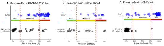 Distribution of esophageal adenocarcinoma (EAC) and control sample probability scores as classified by PromarkerEso into Low-, Moderate- and High-Risk categories in development cohort (A) PROBE-NET and validation cohorts (B) Ochsner and (C) VCB. Actual outcomes are represented as blue dots (EAC) and black dots (Negative Controls or General Population). Lower and upper cutoffs (20% and 75% respectively) are represented by red dotted lines.