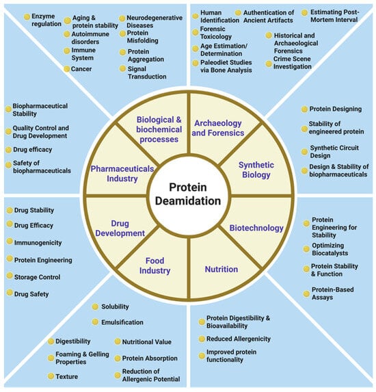 Deamidation also poses major challenges for therapeutic protein development. Chemical degradation and modifications like deamidation, oxidation, and disulfide bond disruption affect protein stability, bioactivity, and immunogenicity [20]. Therapeutic proteins, peptides, and antibodies can undergo deamidation during production, storage, or even before administration to patients, leading to significant changes in drug purity, stability, bioactivity, and antigenicity [21,22]. Consequently, significant efforts have been dedicated to optimizing the manufacturing and storage conditions to minimize deamidation. Beyond biomedicine, deamidation has practical applications in food science and biotechnology. Deamidation enhances the functional properties of food proteins, such as emulsification, gelling, and stability [23], and contributes to the bioactivity of protein–saccharide conjugates with therapeutic potential such as antibacterial, antidiabetic, anti-osteoporosis, anti-inflammatory, anticancer, and immune-regulatory effects [24]. Additionally, deamidation is employed in quality control and historical protein analysis in art restoration, archeology, and forensics [25,26,27].