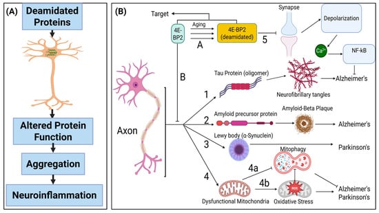 Neurons are the fundamental units of the nervous system, forming the structural and functional basis of the brain and spinal cord. As essential and largely non-renewable cells, any damage or loss of neurons is typically irreversible. A hallmark shared by many neurodegenerative diseases is the misfolding and aggregation of proteins, which initiates a cascade of events leading to progressive neuronal dysfunction and degeneration, a process collectively referred to as neurodegeneration. This process of neurodegeneration is central to disorders such as Alzheimer’s disease (AD), Parkinson’s disease (PD), Huntington’s disease (HD), and amyotrophic lateral sclerosis (ALS). PTMs such as deamidation promote protein aging by gradually altering conformation, increasing the aggregation propensity, and enabling escape from cellular quality control, thereby contributing to neurodegenerative pathology. The schematics of the consequences of deamidation in neurons are shown in Figure 2A. A unified theory based on axonal deamidation was proposed by Davis Joseph [70] (Figure 2B), highlighting the role of 4E-BP2 deamidation in neuronal projections, primarily axons, in regulating neurodegenerative diseases such as Alzheimer’s and Parkinson’s. This mechanism integrates four key biochemical pathways: deamidation, translational control, neurodegeneration, and oxidative stress.