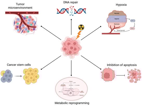 Primary mechanisms of radiotherapy resistance. Created in BioRender. Perico, D. (2025) https://BioRender.com/82u1fab, accessed on 14 April 2025.
