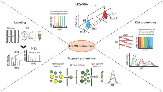 Regarding MS acquisition settings, LFQ can be conducted with two different strategies: data-dependent (DDA) and data-independent (DIA) acquisition. In DDA [123], the mass spectrometer alternates between MS1 and MS2 scans so that it can detect all precursor ions and select the most intense ones (top N strategy) for fragmentation. The selection is dynamically influenced by peptide abundance in the sample, and an exclusion time is set to avoid the repeated selection of the same ion and to pick less intense signals. In DIA [124], the entire mass range of interest is divided into isolation windows of predefined sizes (fixed or variable depending on the ion density along the mass range), and all ions detected within each window are simultaneously fragmented and analyzed. DDA ensures high sensitivity and specificity, an efficient dynamic range, and robust data analysis that relies on established pipelines for identification, quantification, and statistical analysis (e.g., Proteome Discoverer by Thermo Fisher Scientific, MaxQuant, FragPipe, OpenMS) [125]. DDA suffers from limited reproducibility, undersampling of low-abundance peptides, bias towards highly abundant peptides, and the presence of missing values across samples due to stochasticity in ion selection. DIA overcomes most of the DDA limitations, providing higher reproducibility, consistent and comprehensive data collection, and improved quantification accuracy due to data completeness. DIA issues involve reduced specificity and higher data complexity due to co-isolation and co-fragmentation of ions that can impair identification. Moreover, the complexity of spectra is challenging from a computational point of view and requires dedicated platforms. Traditionally, DIA employed spectral libraries generated from DDA runs [126] to extract all the information for protein identification. This method gained popularity due to high-confidence quantification, but it can be challenging and time-consuming. More recently, software developed for DIA proteomics (e.g., Spectronaut by Biognosys, DIA-NN, FragPipe, Skyline) implemented the so-called library-free approach [127], in which the identification is performed directly from DIA data, and powerful algorithms make in silico predictions of peptide fragmentation patterns and retention times from protein sequence databases. Advancements in DIA proteomics are making these platforms increasingly reliable for protein quantification and the handling of high-throughput data for large-scale studies.