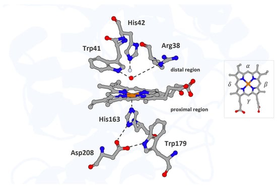 The active site of APX and its immediate environment are characterized by conserved structural features typical of the peroxidase superfamily. In all structurally characterized peroxidases, the proximal His163 and Asp208 adopt conserved positions, forming the canonical Asp–His–Fe triad, in which the heme iron is coordinated by His163, whose non-coordinating Nδ atom hydrogen bonds to a neighboring aspartate. This Asp–His–Fe triad is a defining structural motif of the peroxidase superfamily and has traditionally been considered indispensable for catalysis [18,49]. By contrast, a proximal Trp179 is unique to cytochrome c peroxidase (CcP) and APX, whereas most other peroxidases possess phenylalanine at this position. In APX, on the distal face, the iron ligand is flanked by a hydrogen-bonding Trp41, alongside His42 and Arg38, which interact with the oxo group via bridging water molecules and contribute to its stabilization during catalysis [49,51] (Figure 1).