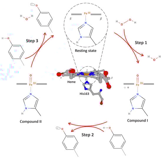 The one-electron reduction of Compound I by a substrate yields Compound II, which retains the ferryl heme moiety Fe (IV)=O but lacks the porphyrin-centered radical (Figure 2, Step 2). Compound II is reduced back to the resting state via a second electron transfer from a substrate (Figure 2, Step 3) [52,54,56,57,58].